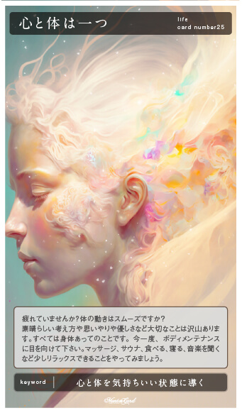 日常生活の中で「アドバイスが欲しいな」と感じられた時に、それを心に浮かべながらカードをシャッフルして、「コレ!!」と思ったカードを引いてみてください。